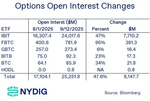 值得注意的是,FBTC 是唯一未获批将持仓限额提高 10 倍的现有 BTC ETF,因为其未提交相关申请。我们最初预计,这可能会威胁到它作为第二大 ETF 的地位。然而,FBTC 却取得了最强劲的增长。可能的解释是,交易者此前对 FBTC 期权的利用不足,因此尽管持仓限额未变,但仍有空间实现超额增长。