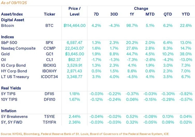 WEEX 唯客交易所数据显示,上周 Bitcoin 上涨 4.2%,一度突破 11.6 万美元,随后回落。上周几乎所有其他资产类别也均出现上涨,标普 500 指数和纳斯达克 100 指数均创历史新高。黄金上涨近 2%,年初至今回报率达到 38%。债券也表现不错,投资级债券、公司债券和长期美国国债均有所上涨。